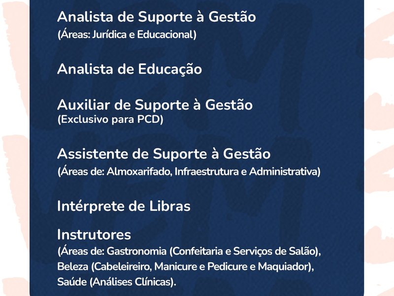 • Analista de Suporte à Gestão: nas áreas Educacional e área Jurídica;• Assistente de Suporte à Gestão: nas áreas Administrativa, Almoxarifado, Infraestrutura;