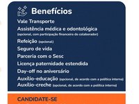 O candidato que for selecionado e contratado, além da remuneração, receberá vale transporte, assistência médica (opcional, com participação financeira do colaborador), assistência odontológica (opcional), vale refeição (opcional), seguro de vida, parceria com o Sesc, licença paternidade estendida, day-off no aniversário e auxílio-creche.