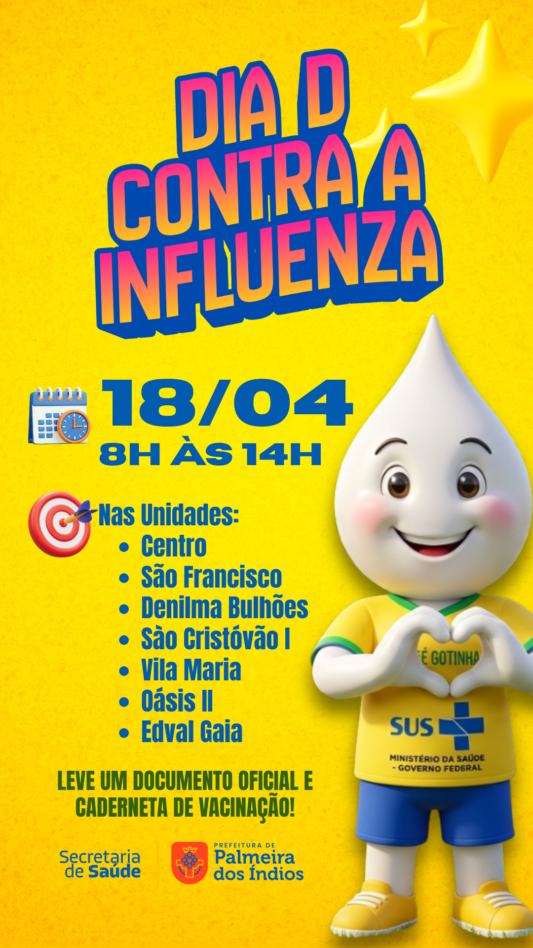 A Secretaria de Saúde de Palmeira dos Índios (SMS) realizará o DIA D contra a Influenza neste sábado (18). O imunizante contra a gripe estará disponível, das 8h às 14h, nas seguintes unidades de Saúde: UBS Centro, UBS São Francisco, UBS Denilma Bulhões, UBS São Cristóvão I, UBS Vila Maria, UBS Oásis II e UBS Edval Gaia.
