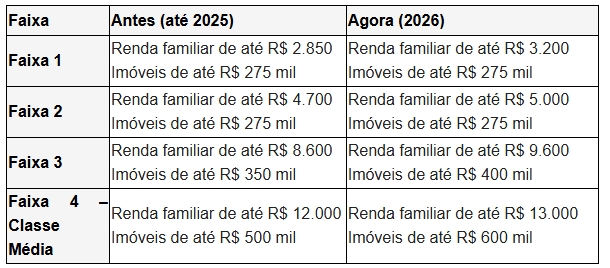Com as mudanças, o programa passa a atender famílias com renda mensal de até R$ 13 mil, incluindo de forma mais ampla a classe média. Também houve aumento dos tetos dos imóveis financiáveis, que agora podem chegar a R$ 400 mil na Faixa 3 e a R$ 600 mil na Classe Média, enquanto as Faixas 1 e 2 seguem com limites regionais definidos de até 275 mil de acordo com o porte de cada municípios.