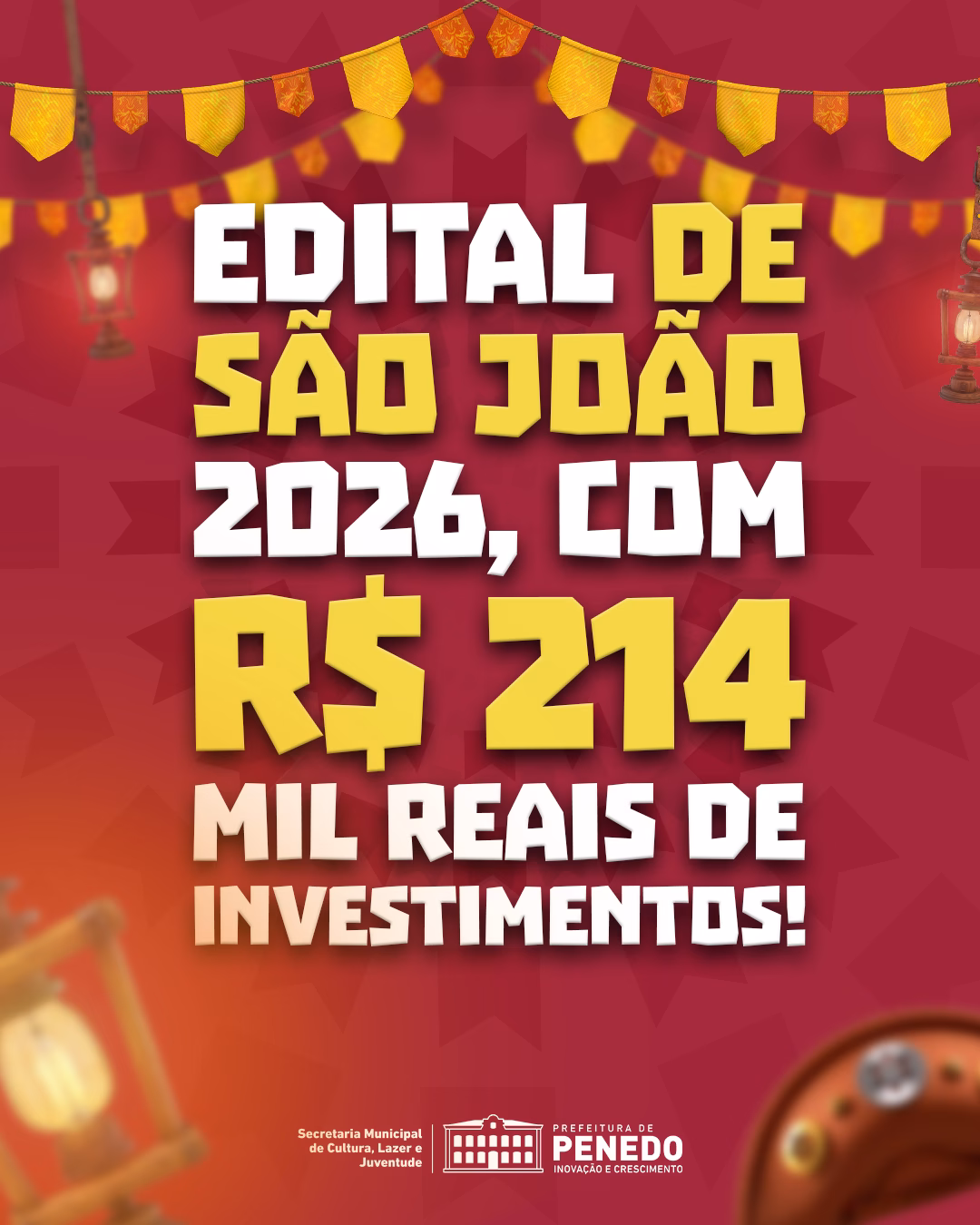 O Edital de Valorização Junina 2026 chega como mais uma ação estratégica da Prefeitura de Penedo para incentivar a produção cultural local, gerar oportunidades e valorizar artistas que fazem do período junino uma das maiores expressões culturais da cidade.
