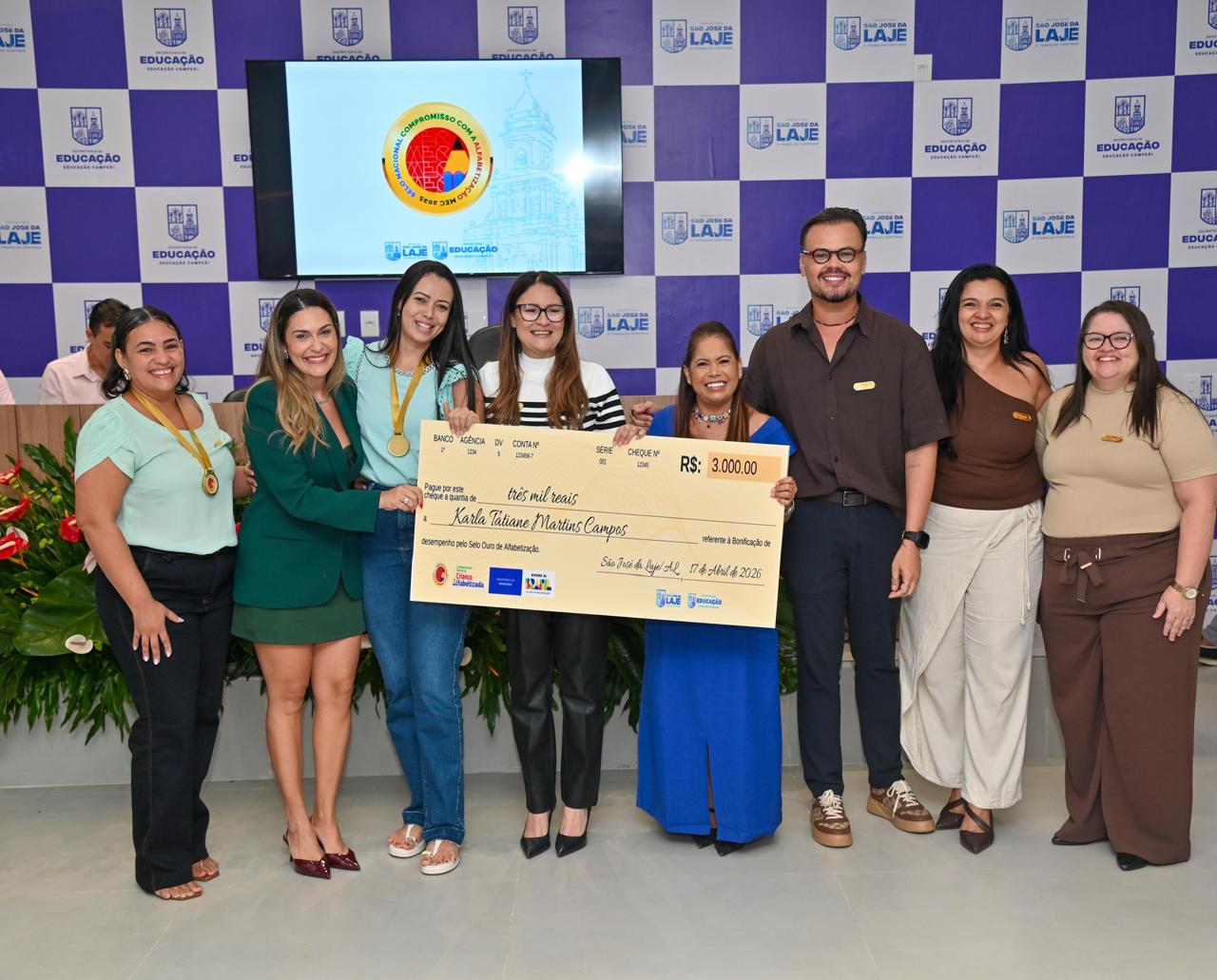 Como parte da política de incentivo por desempenho, foram entregues bonificações financeiras aos docentes que se destacaram nos critérios de fluência em leitura e escrita dos 2º anos: 1º lugar: Karla Tatiane Martins Campos (Escola Municipal Prefeito José Nunes de Arruda) – Premiada com R$ 3.000,00. 2º lugar: Antônio Peixoto da Silva Junior (Escola Municipal Profa. Vanda Paiva) – Premiado com R$ 2.000,00. 3º lugar: Maria Betânia da Conceição (Escola Municipal Hosana Araújo) – Premiada com R$ 1.500,00.