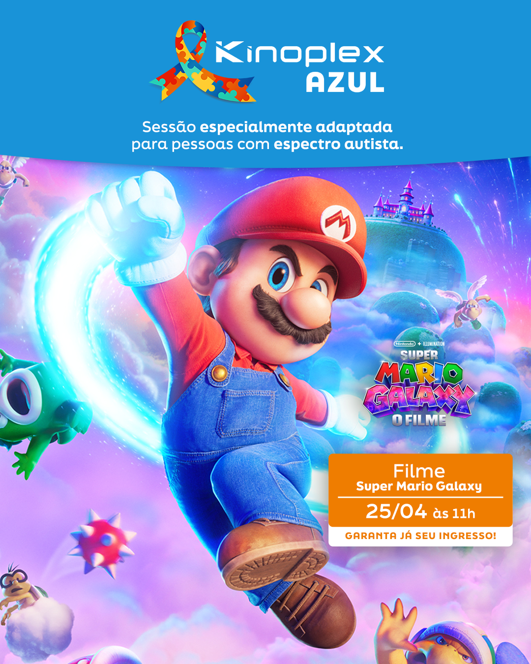 No próximo dia 25 de abril (sábado), às 11h, crianças e adolescentes no espectro autista e suas famílias terão a oportunidade de assistir ao filme ‘Super Mario Galaxy”. O filme, lançado recentemente, foi a escolha da empresa para a edição deste mês do Kinoplex Azul, projeto que exibe, mensalmente, sempre aos sábados, sessões adaptadas para pessoas com espectro autista nos cinemas da rede. A exibição também marca o Abril Azul, mês mundial de conscientização sobre o Transtorno do Espectro Autista (TEA).