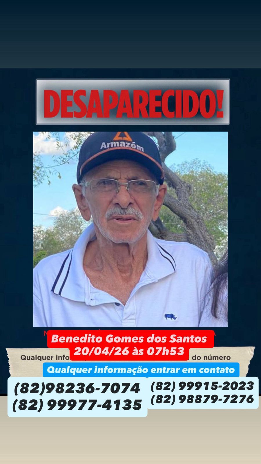 As instâncias públicas de segurança de Delmiro Gouveia seguem mobilizadas em uma operação contínua e integrada para localizar Benedito Gomes dos Santos, o “Bené do Leite”, de 77 anos. O idoso desapareceu na manhã da última segunda-feira (20), nas imediações do Posto Fiscal, às margens da BR-423, zona rural do município.