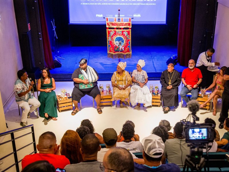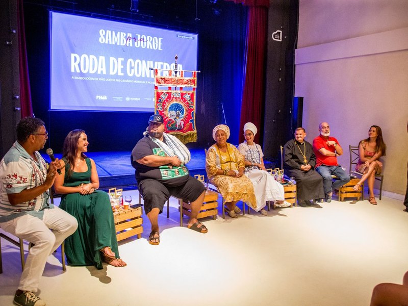 Após a oficina, o palco do Theatro Homerinho deu espaço a um debate que ampliou o olhar sobre a figura de São Jorge. A roda de conversa reuniu representantes de diferentes áreas e tradições religiosas para discutir o simbolismo do Santo Guerreiro no contexto cultural brasileiro, especialmente no samba.