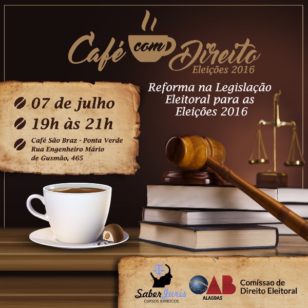 O presidente da Comissão de Direito Eleitoral da OAB Alagoas, Henrique Vasconcellos, já confirmou presença no evento Café com Direito, realizado pelo Saberjuris. O evento irá acontecer no dia 7 de julho, a partir das 19 horas, no Café São Braz, na Ponta Verde, com o objetivo de debater assuntos eleitorais.