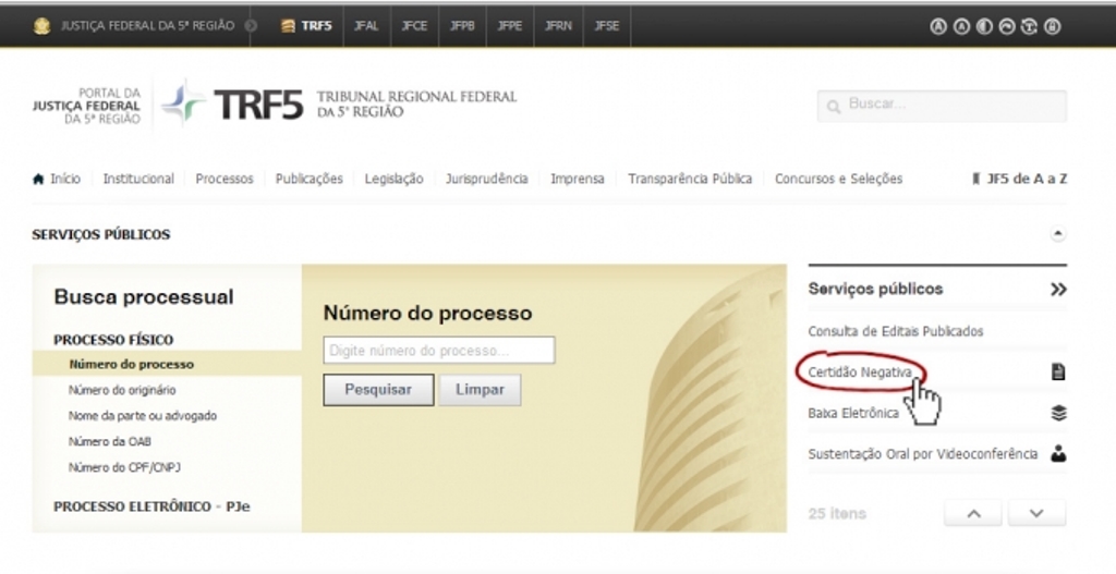 Para solicitar a certidão, o candidato deve acessar o site www.trf5.jus.br e, à direita, na seção “Serviços Públicos”, clicar em “Certidão Negativa” (imagem em anexo). A validade é para todo o Brasil, por 90 dias, após a data de emissão.