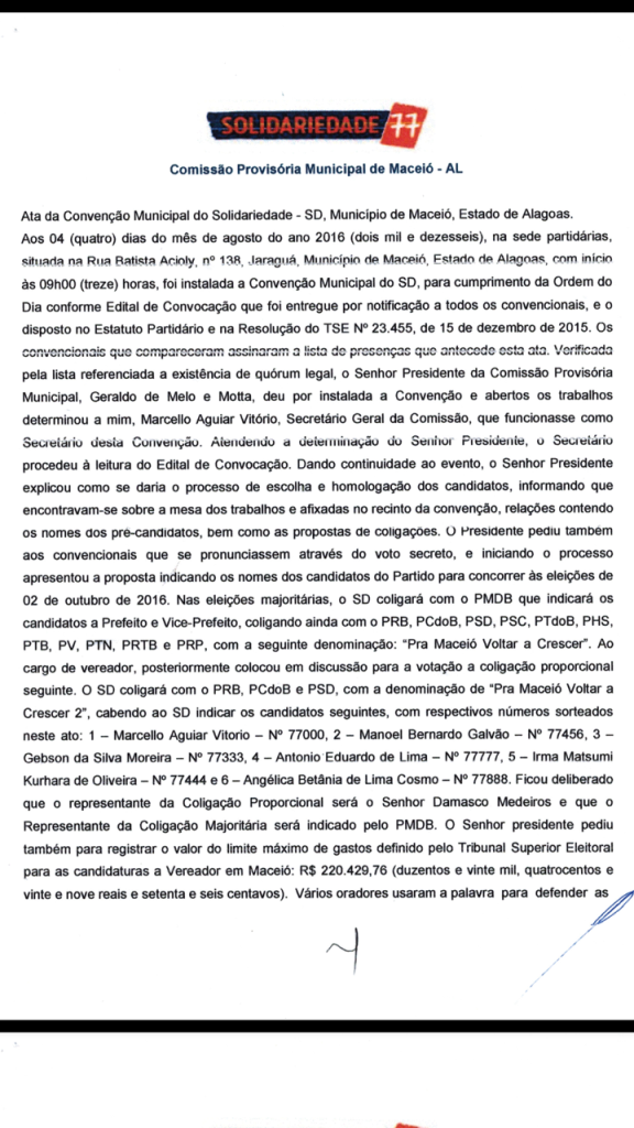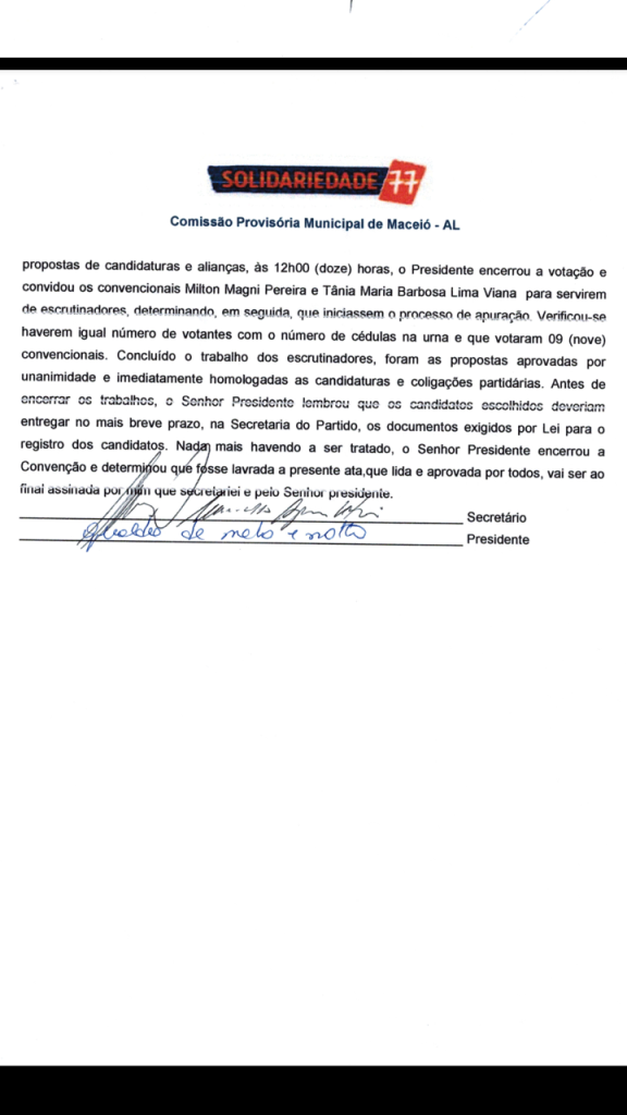 Dessa forma o Solidariedade estará compondo a aliança politica em torno de Almeida, conforme ata da convenção partidária que segue abaixo.