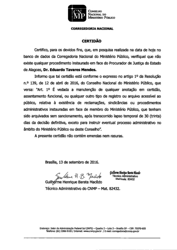 No comício realizado, no último dia 11, no Povoado Vila São José, o candidato Erasmo Dias, do Partido Social Cristão (PSC), afirmou que Eduardo Tavares respondia processo no Conselho Nacional do Ministério Público (CNMP), acusação essa devidamente e imediatamente refutada pelo Conselho Nacional do Ministério Público (CNMP) e pela Associação do Ministério Público de Alagoas (AMPAL), através da emissão de certidões anexadas aos autos das ações impetradas. Desta feita, o Juiz Eleitoral Maurício César Breda Filho, concedeu liminar que impede a divulgação de fatos inverídicos e que ofendam a honra do Procurador de Justiça licenciado, sob pena de aplicação de multa no valor de R$ 10 mil. Nas searas criminal e cível, as ações seguem seu rito normal.