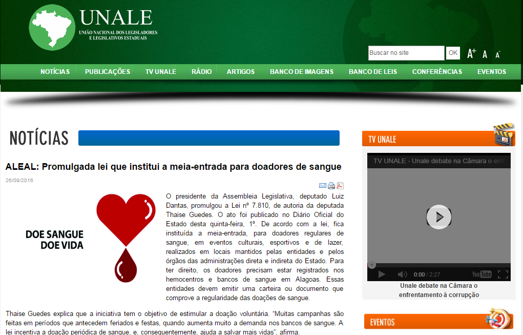 Matéria veiculada no portal da Assembleia Legislativa de Alagoas é destaque nacional no site da União Nacional dos Legisladores e Legislativos Estaduais (Unale) nesta segunda, 26. Produzido pela equipe da Diretoria de Comunicação do Parlamento alagoano, o texto registra a promulgação da Lei nº 7.810, que garante a meia-entrada a doadores de sangue, no âmbito do Estado. A lei é de autoria da deputada Thaíse Guedes (PMDB), e foi promulgada pelo presidente da Casa, deputado Luiz Dantas, conforme ato publicado no Diário Oficial do Estado no dia 1º deste mês.