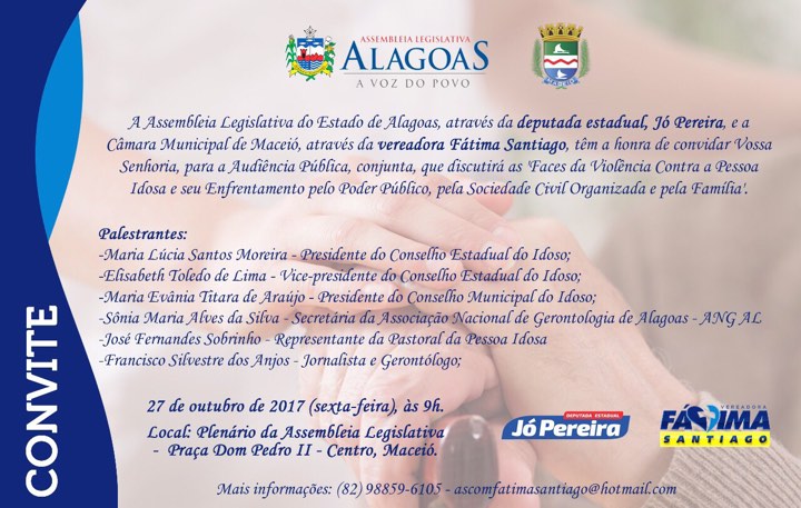 Proposta conjuntamente, pela vereadora Fátima Santiago, e pela deputada estadual Jó Pereira, a Câmara Municipal de Maceió e a Assembleia Legislativa de Alagoas, discutirão, na próxima sexta-feira (27), em Audiência Pública as 'Faces da Violência Contra a Pessoa Idosa e seu Enfrentamento pelo Poder Público, pela Sociedade Civil Organizada e pela Família'. O encontro que reunirá representantes de vários órgãos municipais e estaduais, acontecerá no plenário da Assembleia, localizado no centro da cidade, às 9h.