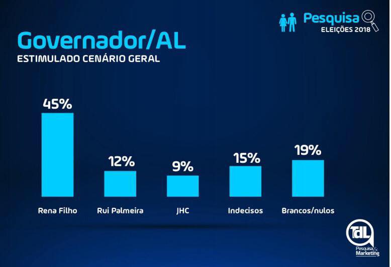 De acordo com a pesquisa estimulada , Renan Filho lidera com 45% das intenções de votos. O atual prefeito de Maceió, Rui Palmeira (PSDB) aparece com 12% e o deputado federal JHC (PSB) soma 9% das intenções de votos. Indecisos somam 15%; brancos e nulos somam 19%. Renan Filho também lidera a pesquisa em todas as regiões do Estado, inclusive na capital alagoana.