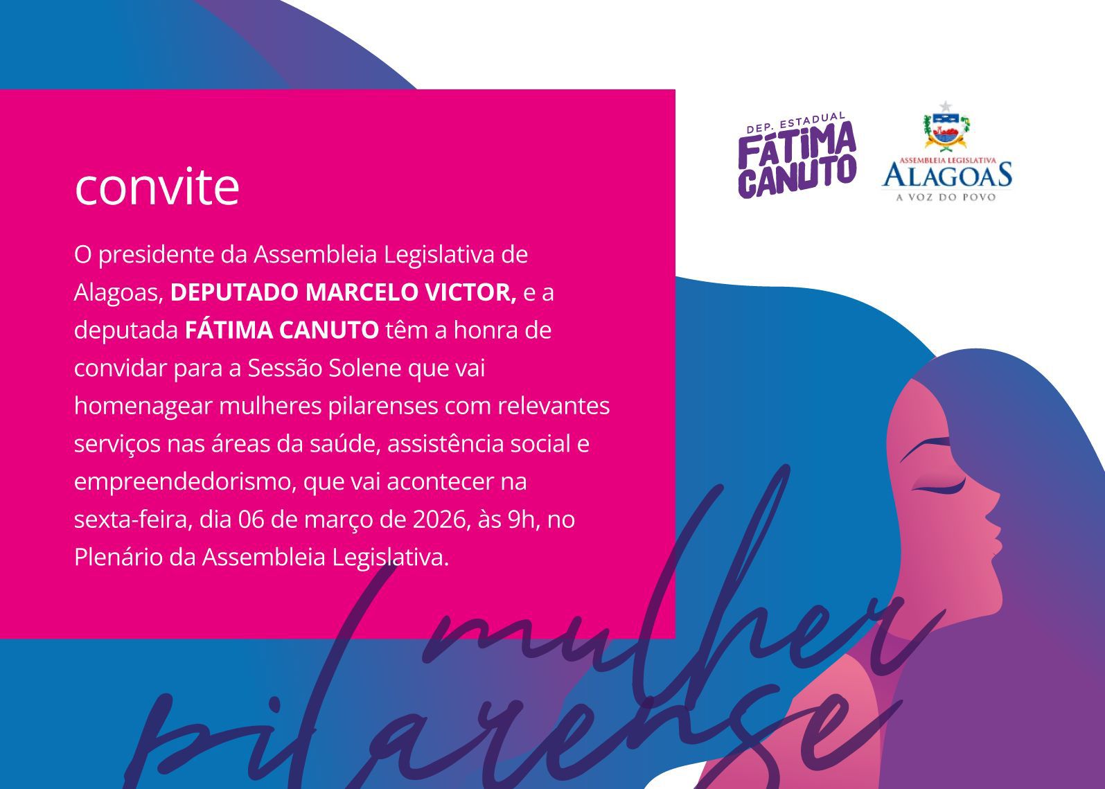 A Assembleia Legislativa realiza nesta sexta-feira, 6, uma sessão solene, de autoria da deputada Fátima Canto (MDB), para a entrega de comendas a mulheres pilarenses que se destacam nas áreas do empreendedorismo, da saúde e da atuação social. A solenidade ocorre em alusão ao mês da mulher e ao mês de emancipação do município de Pilar.